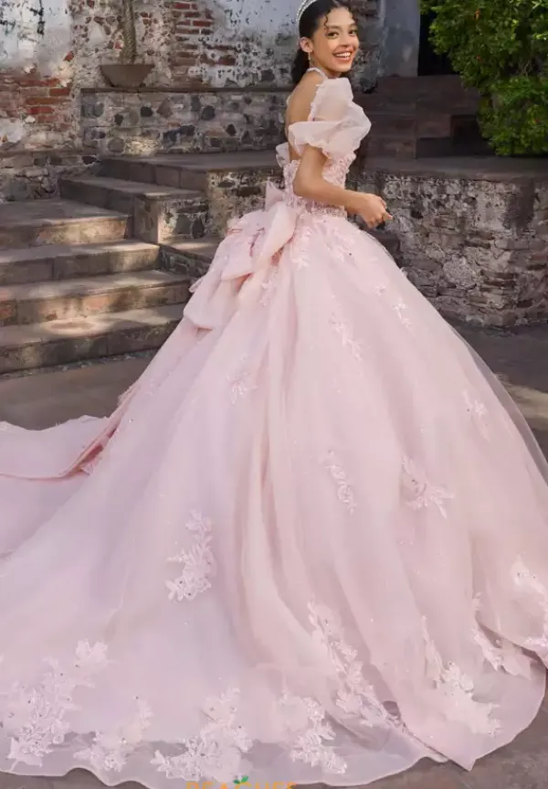 Unforgettable nights begin with unforgettable dresses such as this ravishing ballgown by Vizcaya Quinceanera, style 89542. This mesmerizing bodice features a sweetheart neckline with detachable tulle puff sleeves. A blend of embroidery and applique graces the bodice with intricate detail that cascade into the organza and glitter tulle creating a full skirt that shimmers and floats with every step. Finished with a extravagant bow at the back leaving an ultimate fabulous statement.