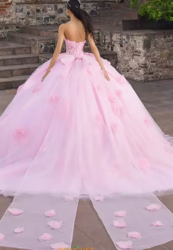 Make a lasting impression in this unforgettable ballgown by Vizcaya Quinceanera, style 89562. Featuring a halter-style strapless V-neckline, exuding modern elegance. The bodice is made from applique and adorned with delicate beading for a captivating finish. The voluminous skirt is made from glitter tulle and accented with glitter tulle roses, adding texture and sparkle throughout. A long, detachable halter neck tie adds a versatile touch, style it around the neck or the waist for a chic bow effect that completes the look.