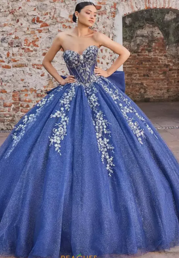 Be the spotlight of the night in this truly captivating ballgown by Vizcaya Quinceanera, style 89563. Featuring a endearing sweetheart neckline with off-the-shoulder straps exuding elegance. Bold beading paired with intricate applique adorns the corset and flows seamlessly into the long glitter tulle train. Completing the look, a dramatic bow cascades to match the length of the train. For an unforgettable entrance, a detachable high collar with scalloped detailing adds a regal touch that’s sure to leave everyone in awe as they see you.