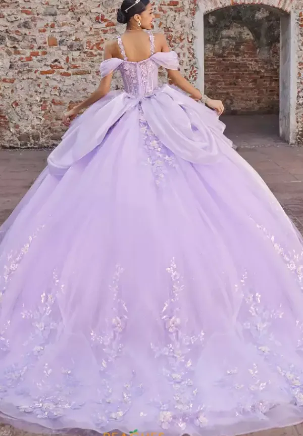 Dance the night away in this timeless ballgown by Vizcaya Quinceanera, style 89565. Featuring a graceful sweetheart neckline and detachable off-the-shoulder sleeves with delicate floral straps, this mesmerizing gown is truly one of a kind. The bodice is adorned with intricate beading and sequins that flow beautifully into the long organza train. Finished with captivating sequin applique, the train adds an enchanting touch to this unforgettable dress.