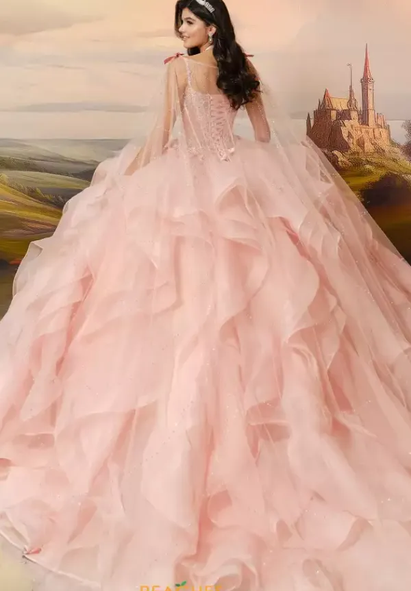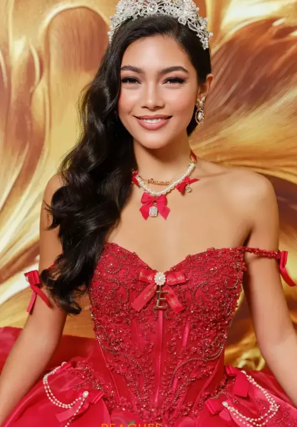 This impeccable, one of a kind Quinceañera gown by Princesa, style PR30204, is the perfect choice for your special night. The beautifully beaded bodice is adorned with intricate applique and finished with a dainty bow at the center for a charming touch. A detachable long cape adds dramatic flair, ensuring all eyes are on you. The lace up back includes a modesty panel for a secure and graceful fit—balancing modesty with allure. Finishing details include a signature initial brooch and the iconic Princesa logo. To complete this regal look, the gown comes with a stunning, intricately designed necklace that adds the perfect final touch.