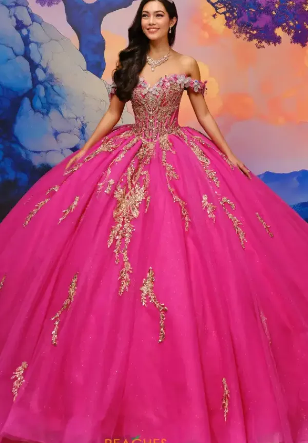 Hear gasps when you enter the room wearing this phenomenal Quinceanera gown by Princesa Quinceanera, style PR30207. Showcasing a lovely sweetheart neckline with floral detachable off the shoulder straps for that two in one look. This bodice is a gorgeous corset with a corset lace up. The voluminous glitter tulle skirt has pockets and a one of a kind detachable bow. Adorned with lace, beadwork and applique, ensuring you shine all night. Back modesty panel and capelet included.