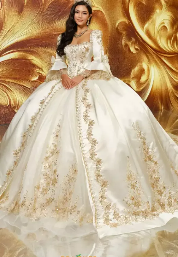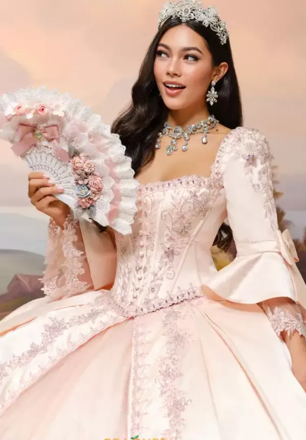 Feel like royalty in this Princesa Quinceañera gown, style PR30210. This elegant and one of a kind dress features detachable off the shoulder straps, offering both versatility and comfort. The intricately detailed bodice is designed to turn heads, enhanced by a unique corset style jacket that makes this gown truly unforgettable.A built in corset with a lace up back ensures the perfect fit, complete with a modesty panel for added elegance and coverage. The full tulle skirt is richly adorned with applique, beading, glitter, and satin, creating a breathtaking look from every angle.For a final show stopping touch, the gown includes a detachable bow. Not only is this dress stunning, but it’s also practical—with hidden pockets seamlessly tucked into the design for added convenience. This gown includes a breathtaking Princesa logo necklace completing the whole look.