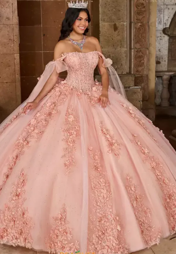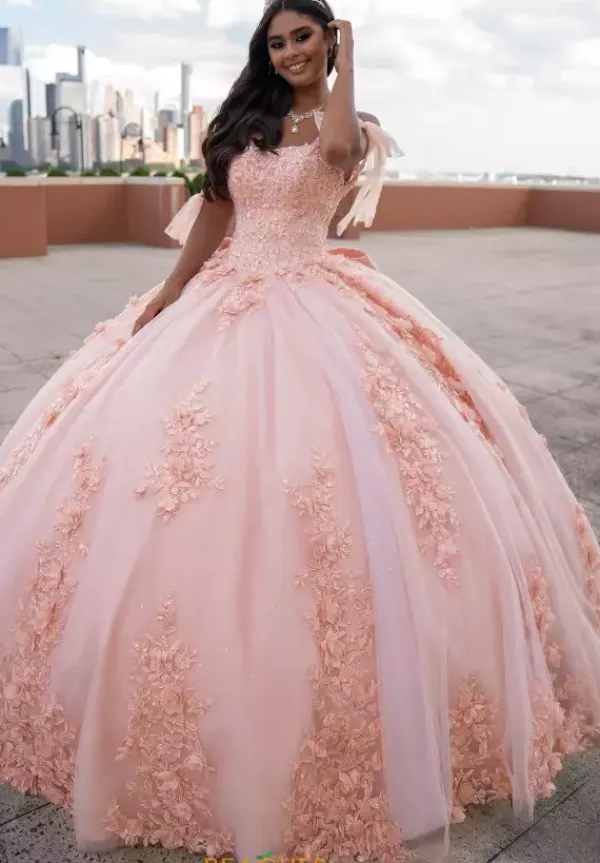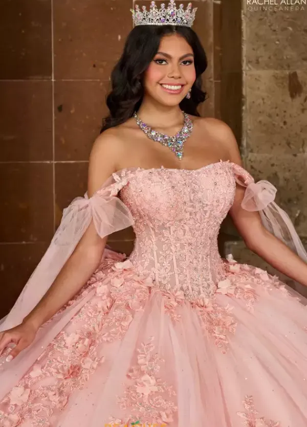 Have all jaws drop when you enter the room while wearing this enchanting long dress by Rachel Allan Quince, style RQ1132. Showcasing an off the shoulder scoop neckline. The corset bodice is adorned with gorgeous applique and gorgeous beadwork that cascade down the dress. A big fabulous bow adorns the back of the dress.