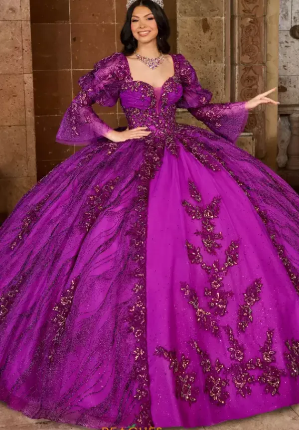 Feel like royalty in this enchanting quinceanera dress by Rachel Allan Quince, style RQ1135. Showcasing a strapless sweetheart neckline with detachable puffy long sleeves. This number is fully adorned with gorgeous applique nd glistening sequins and dazzling beadwork hat cascade down the dress. A fabulous big bow is the perfect final touch.