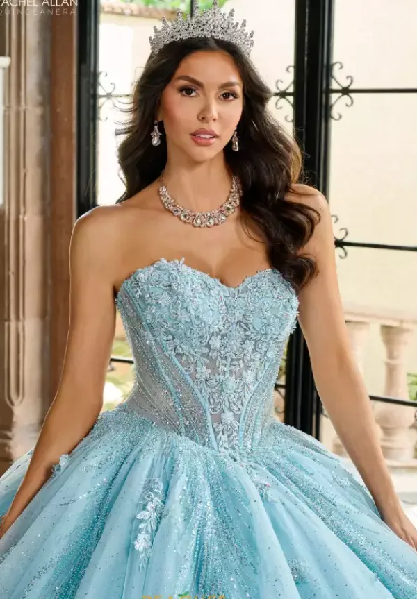Be the belle of the ball in this striking Rachel Allan Quince ball gown style RQ1162. This strapless sweetheart neckline dresses features a drop waist line corset bodice. The dress comes with detachable streamers sleeves and a bodice liner if you prefer a less sheer look. Matching cape sold separately as QS1162.