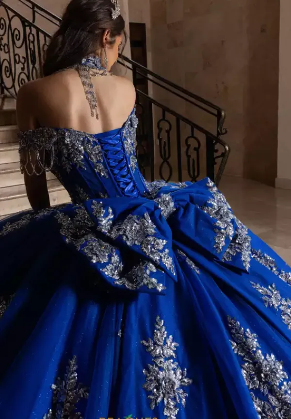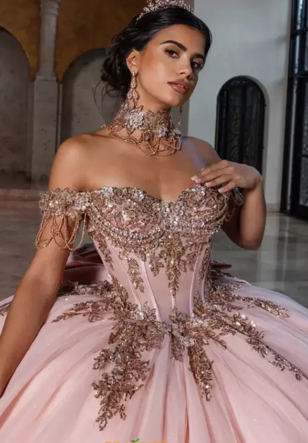 Fill your special day with shimmer when you wear this traditional styled Rachel Allan Quince gown style RQ1183. The off the shoulder sleeves and strapless sweetheart neckline are encrusted in sequin beaded appliques that intricately scatter onto the adjustable corset bodice and voluminous glittering tulle sweep skirt. Matching beaded choker with dangling fringe beadwork is included.