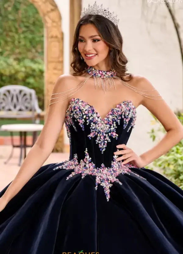 Rich velvet material gives this Rachel Allan quinceanera dress style RQ2198 that regal look. The strapless sweetheart neckline bodice is embellished with multi color rhinestone beading and sequins. The v dip waist is also trimmed with those matching rhinestone beading from the bodice. The full ball gown style skirt is made from rich velvet material.