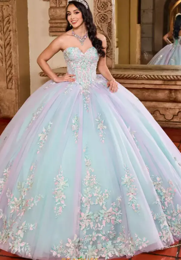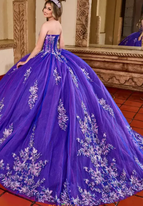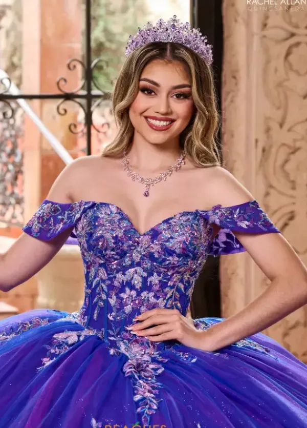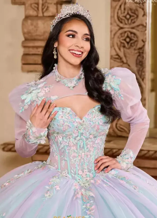 Feel like a true princess on your special day in this Rachel Allan Quince dress style RQ2200. The strapless off the shoulder cap sleeves bodice showcases a long sheer illusion waist with gorgeous sequins floral appliques adorning it. A detachable long sleeve top gives you a two in one look. The tulle layered ball gown skirt is adorned with those matching appliques from the bodice.