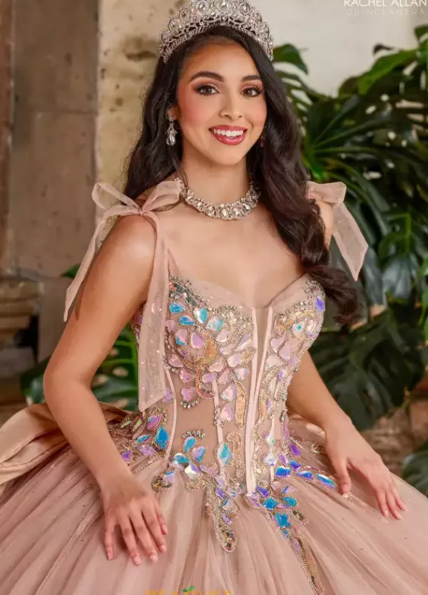 This one of a kind Rachel Allan Quince ball gown style RQ2203 will have all eyes on you. Made only in this fabulous latte color, the dress is embellished with iridescent petal beadwork. The bodice is long waisted with a deep v opening and bow tied shoulder straps. The full tulle ball gown features a extravagant bow with long tails.