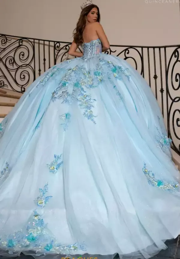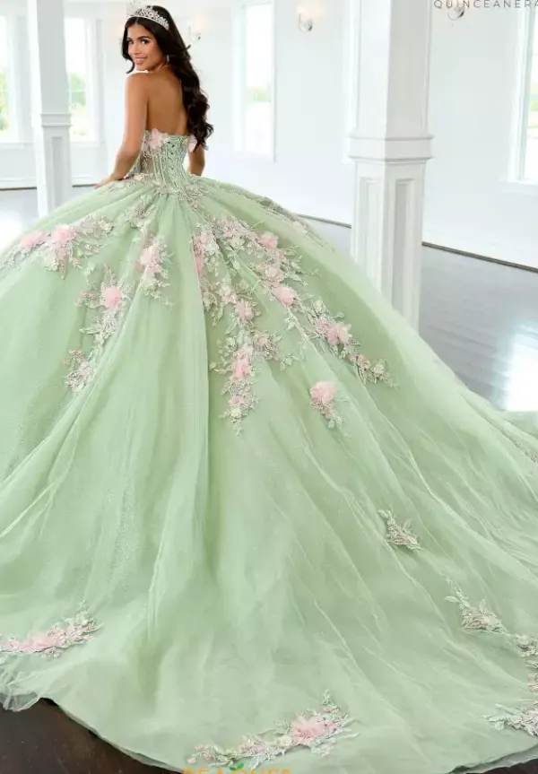 Show off your sense of fashion in this Rachel Allan Quince ball gown style RQ2216. This amazing dress has a strapless sweetheart neckline bodice. Three dimensional flowers adorn the long waisted corset bodice. There is a detachable bodice liner if you want to have the midriff be a sheer illusion. Detachable streamers sleeves give you a two in one look. The full glitter tulle ball gown skirt is adorn with those matching appliques from the bodice.