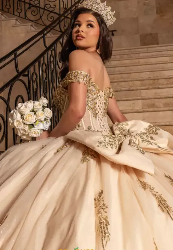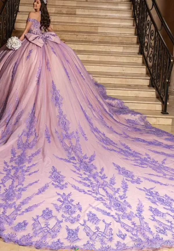 Be untouchable in this striking and glistening Rachel Allan Quince ball gown style RQ2247. Dazzling mixtures of beads, sequins, and appliques shimmer across the glittering tulle fabric of the adjustable corset bodice and dramatic cathedral style sweep train skirt. Intricate patterns decorate the hem and match the detachable bow.