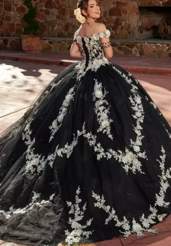 Have the time of your life in ravishing traditional style RQ3117 by Rachel Allan Quince. This ball gown dress is available in regal colors and is complemented by contrasting embroidery and appliques that create stunning patterns throughout the bodice and skirt. Draped beadwork is featured beneath the off the shoulder cap sleeves and the skirt is completed with the classic sweep train.