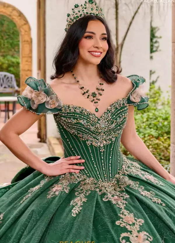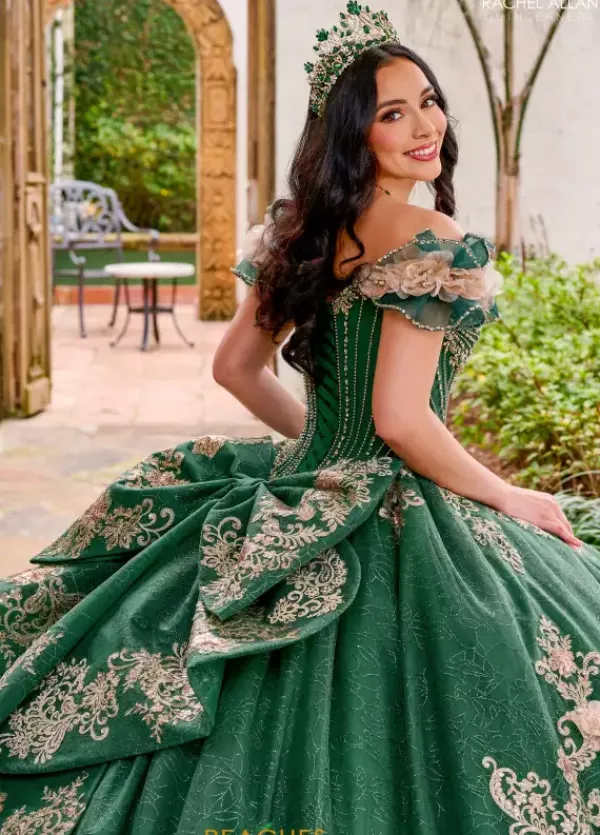 We just love all the details in this amazing Rachel Allan Quince ball gown style RQ3133. The long waisted corset bodice is beautifully beading with rhinestones and showcases off the shoulder cap sleeves with three dimensional flowers. The glitter tulle ball gown skirt has a gorgeous bow in the back and those metallic appliques wrap around the hem of the skirt.