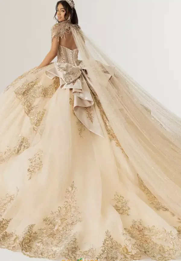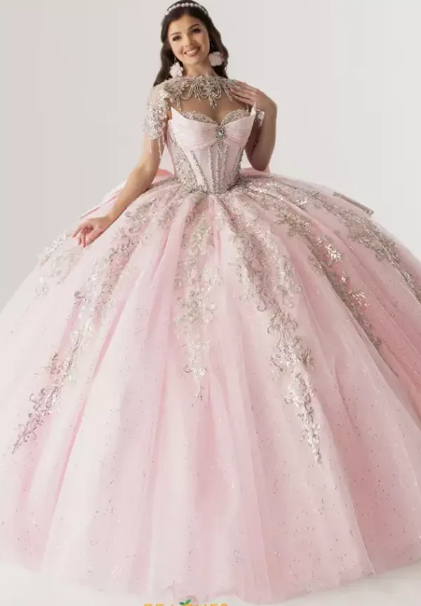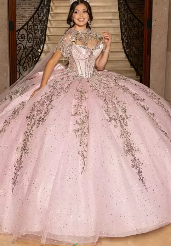 Look and feel as pretty as a princess in this princess styled Rachel Allan Quince ball gown style RQ3172. This sparkling voluminous satin gown includes a matching detachable cape that overlaps the shimmering applique embellished sweep train. The satin bodice has a traditional adjustable lace up closure.