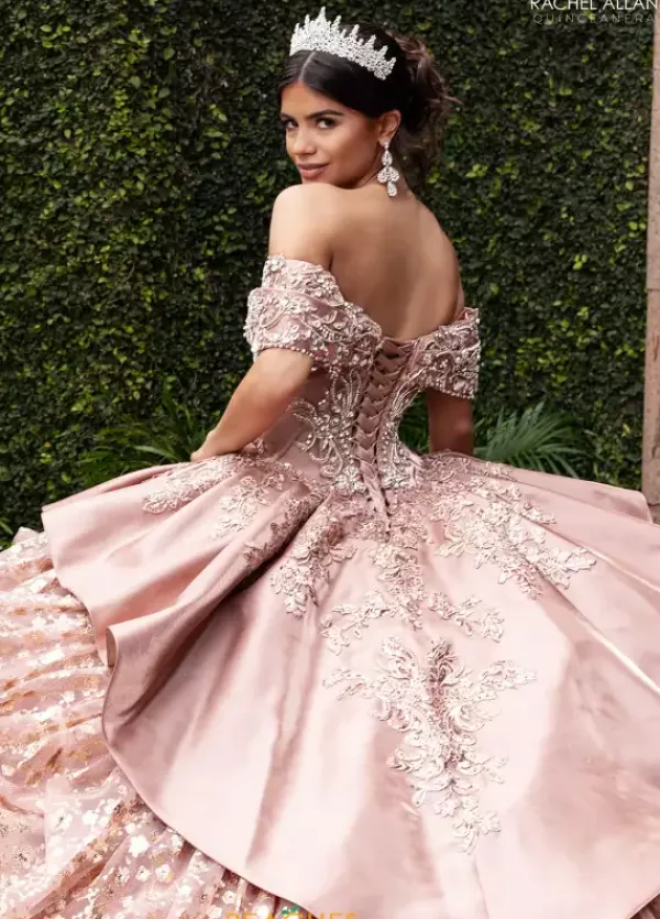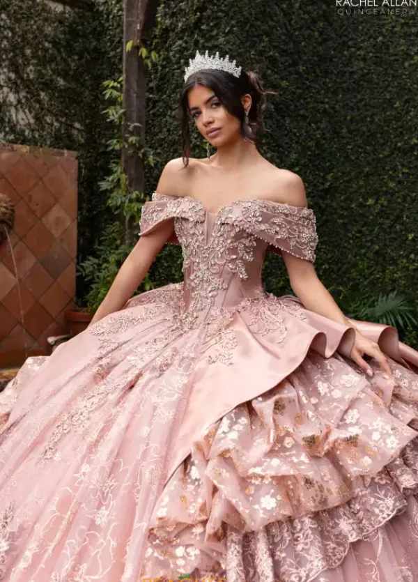 Walk into your special event and wow the crowd wearing Rachel Allan Quince style RQ6001. This magnificent ball gown showcases a fabulous sweetheart neckline paired with off the shoulder cap sleeves. The fitted bodice and full glitter tulle skirt is decorated with unique lace applique and dazzling beadwork adding all the drama.