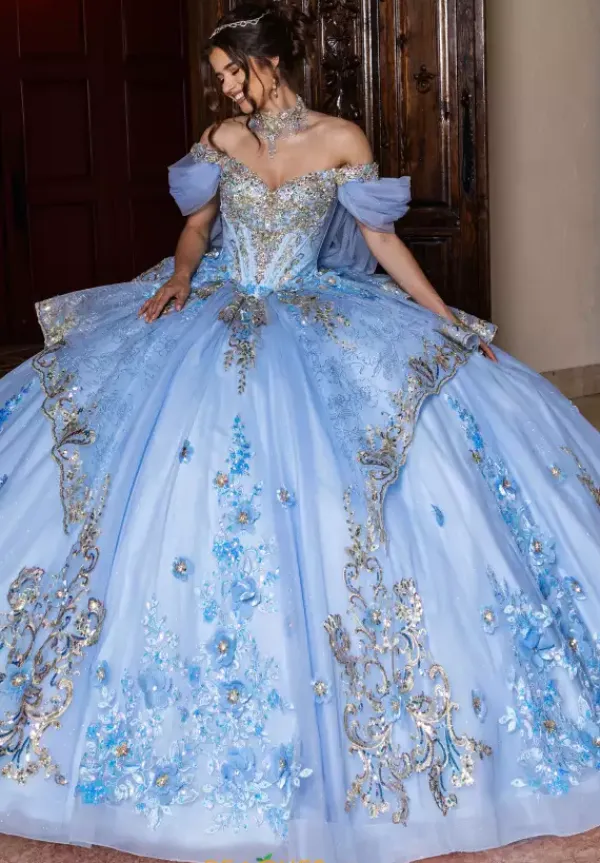 Have heads spinning upon your entrance in spectacular ball gown style RQ6010 by Rachel Allan Quince. The fully embellished fitted lace corset bodice is complimented with detachable puffy cap sleeves and a matching chocker. Showcasing the unique glittered tulle skirt and delicate bow will have all heads turning.