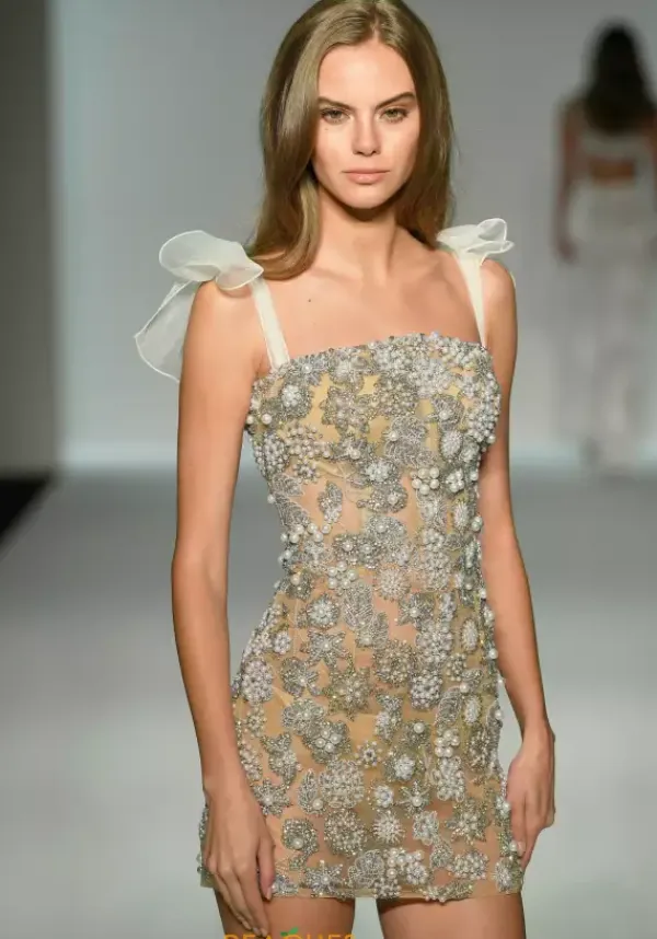 All eyes will be on you when you enter your special event in this short Sherri Hill fitted dress style 57246. Available only in this nude, ivory and silver combination, this fitted dress features a scoop neckline with organza shoulder straps that ties with bows on the top. The dress is hand beading in stunning details of floral inspired clusters.