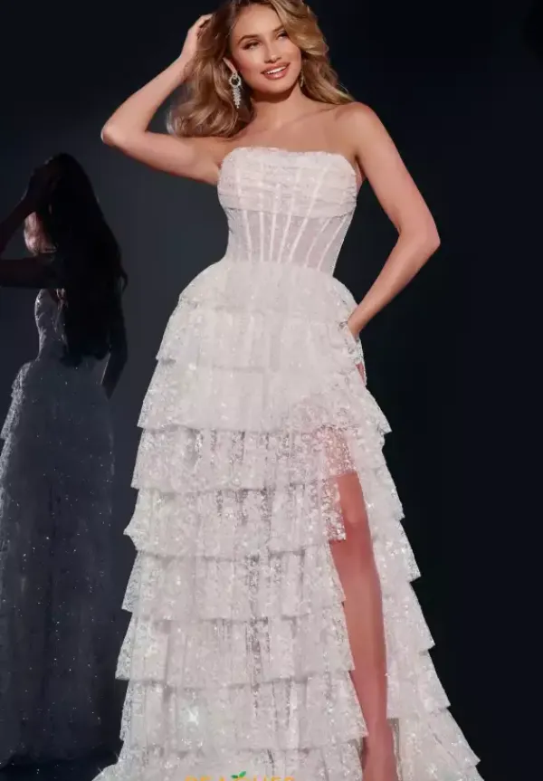 Exude sophistication at prom in this absolutely gorgeous Jovani long dress style 40031 made in intricate sequin embroidery fabric. This scintillating gown showcases an illusion corset bodice with a strapless neckline with pleating, visible boning and low back with zipper closure. The a line, long skirt has tiered ruffle layers with a high, front side slit and back sweep train.