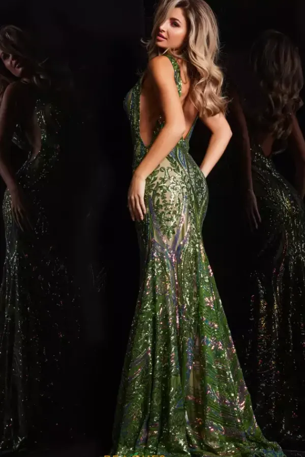 Make a head turning entrance when you light up the room in ultra sparkling long dress 22770 by Jovani. This dress is figure flattering and enhancing with a fitted cut that displays alluring details such as a V neckline, plunging side cutouts with mesh fabric for modesty, and a dramatic sweep train. A stunning combination of iridescent sequins and matching sequins adorn this dress from top to bottom revealing gorgeous and symmetrical beaded patterns that are guaranteed to have all eyes on you.