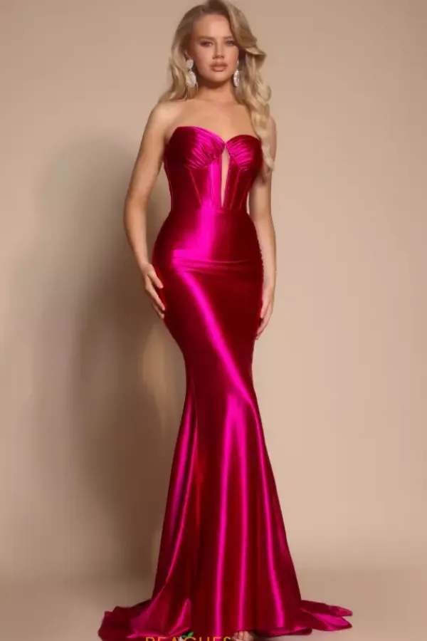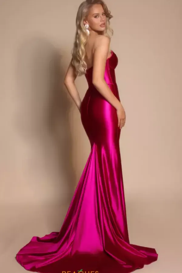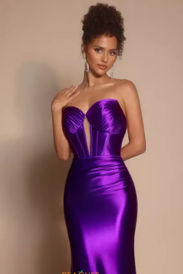 Make the room glow when you wear this non beaded form fitting satin Portia and Scarlett prom dress style XO080. This zipper cinched satin dress is on trend with a strapless ruched sweetheart neckline and daring mesh keyhole cutout down the center of the corset paneling. The sleek skirt is completed with a long sweep train.