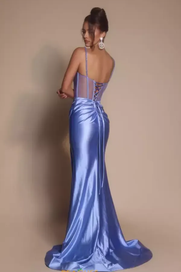 Be the envy of all in this enticing Portia and Scarlett trendsetting prom dress style XO088. Color reflective stone accents adorn the cups of the plunged bodice and trace the dainty spaghetti straps to add sparkle on top of the glowing satin fabric. Ruching is featured on the front and back of the sweep length skirt.