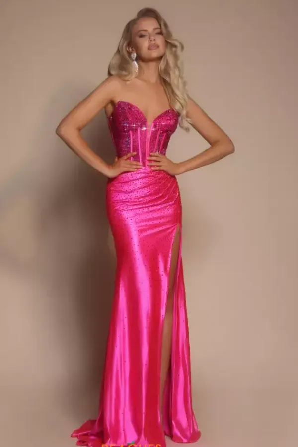 Gleam like no other with shocking long style XO098 by Portia and Scarlett. Eye catching strapless corset bodice is delicately embellished with hot pressed rhinestones all over the illusion bodice. Body hugging sating skirt displays beadwork which cascades down sparsely as it reaches the fly away train.