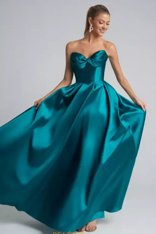 Make that simple elegant statement showing up in long style XO110 by Portia and Scarlett. Strapless fitted bodice is detailed with pleating along the top and displays unique buttons which trims the zipper to add to your overall classy look. Showcasing the matching pleating along the flowing mikado a line skirt.