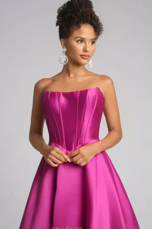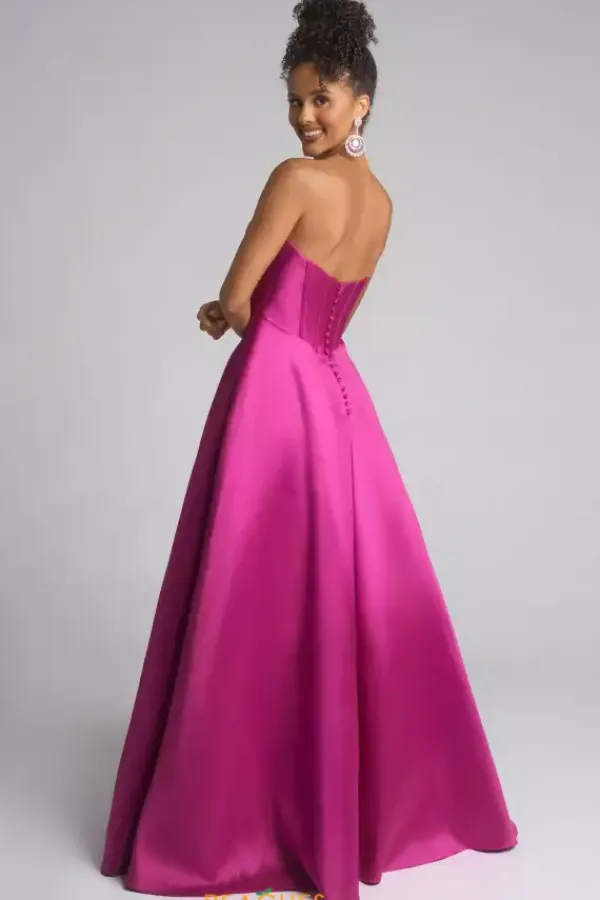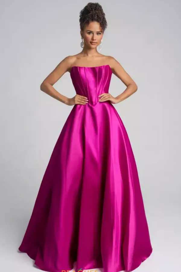 Glamorous yet chic A line dress style XO124 by Portia and Scarlett will have you living your modern day bridgerton moment. Showcasing the fitted bodice detailed with exposed boning and complimented with a strapless scoop neckline. Lovely delicate buttons decorate the tim of the zipper and the entire a line gown is cut from a super comfy satin material.