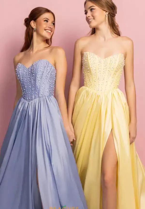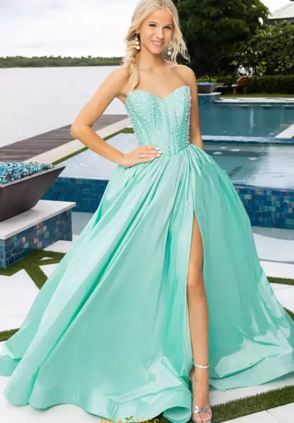 Dance the night away in this fabulous Portia and Scarlett a line dress style XO178. The beautifully hand beaded strapless sweetheart neckline corset bodice has pearl and beading details. The long taffeta skirt falls from your waist with a thigh high slit. The stunning train trails right behind you.