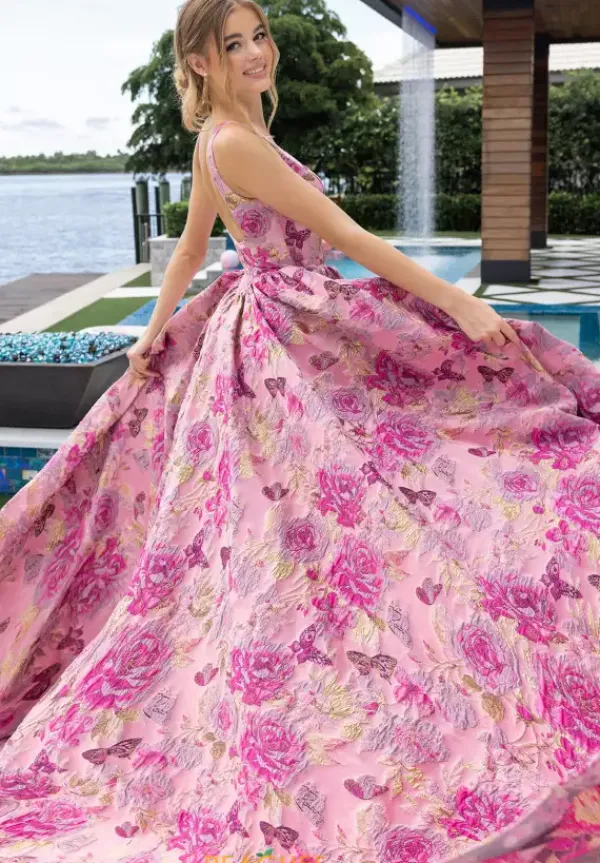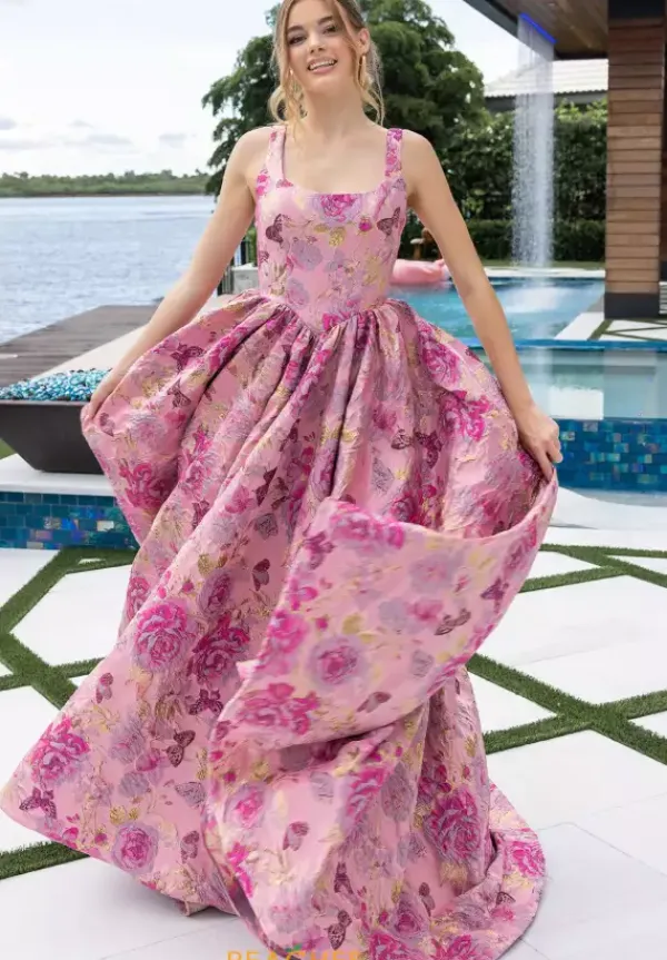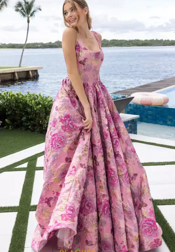 Be regal and elegant in this lovely Portia and Scarlett prom a line dress style XO188. Available only in this novelty brocaded material, this scoop neckline has thick shoulder straps and a drop waist line. The a line skirt falls perfectly from the waist. The lovely skirt has these shades of pink flowers with gold accents.