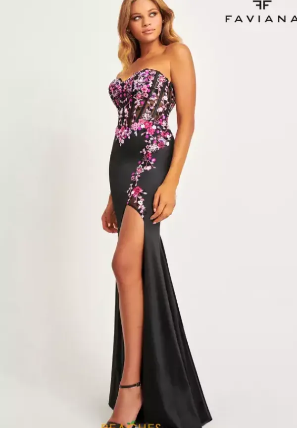 Look ready to attend the met gala in this show stopping long fitted gown by Faviana style 11029. Showcasing a sweetheart strapless neckline on the flattering see through corset bodice. A beautiful floral detailing adorns the bodice that trickles down towards the thigh high slit. A sweep train is added for a touch of glam.