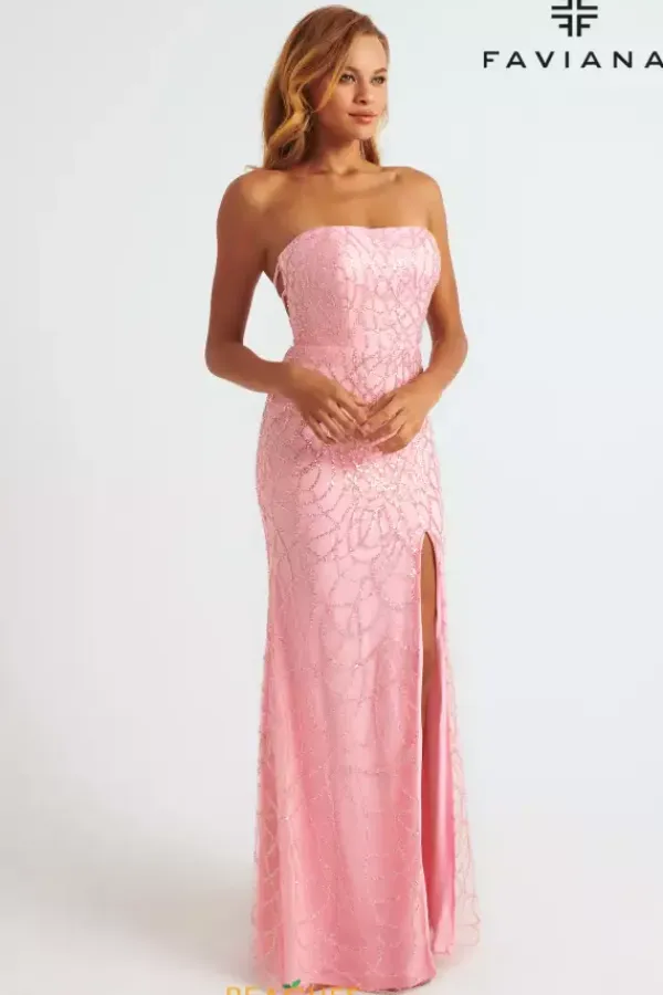 Look picture perfect in this absolutely gorgeous fitted dress 11085 by Faviana for your special event. This silhouette reveals a strapless neckline being held in effortlessly by the custom lace up open back. Completely embellished with intricate patterns of dazzling beadwork, this style will be sure to leave you shining from every angle.