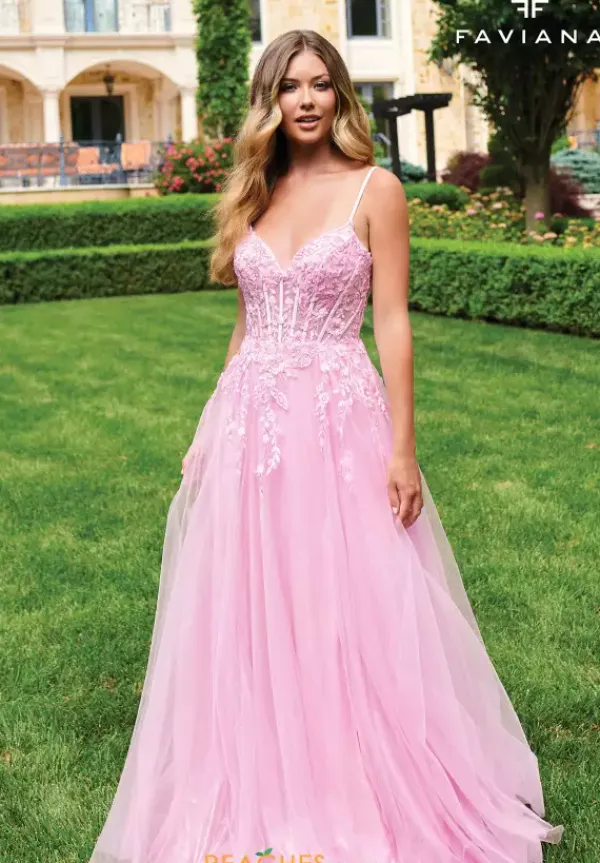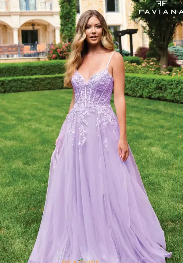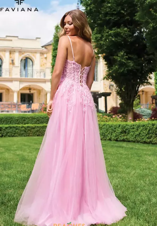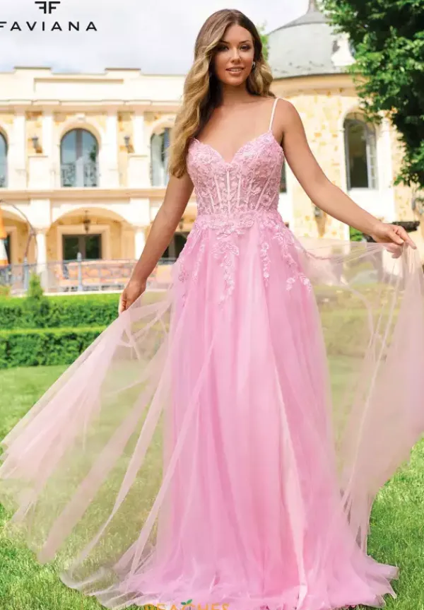 Have everyone taking a second glance as you walk into Prom in this stunning long style 11230 by Faviana. The beautiful dress shows off an illusion bodice embellished with delicate lace applique which trickles down the small of the waist and onto the skirt. Showcasing the flowing tulle skirt detailed with a sweep train to follow you effortlessly.