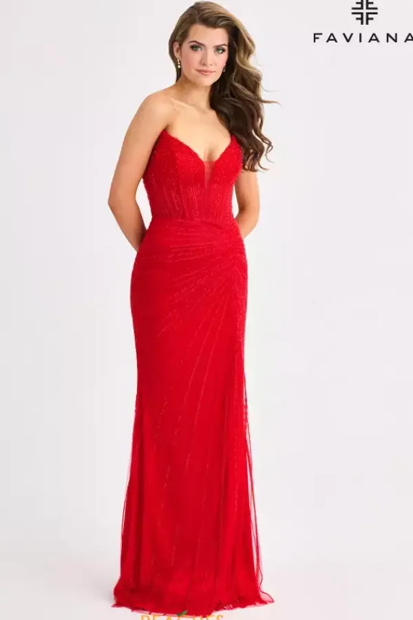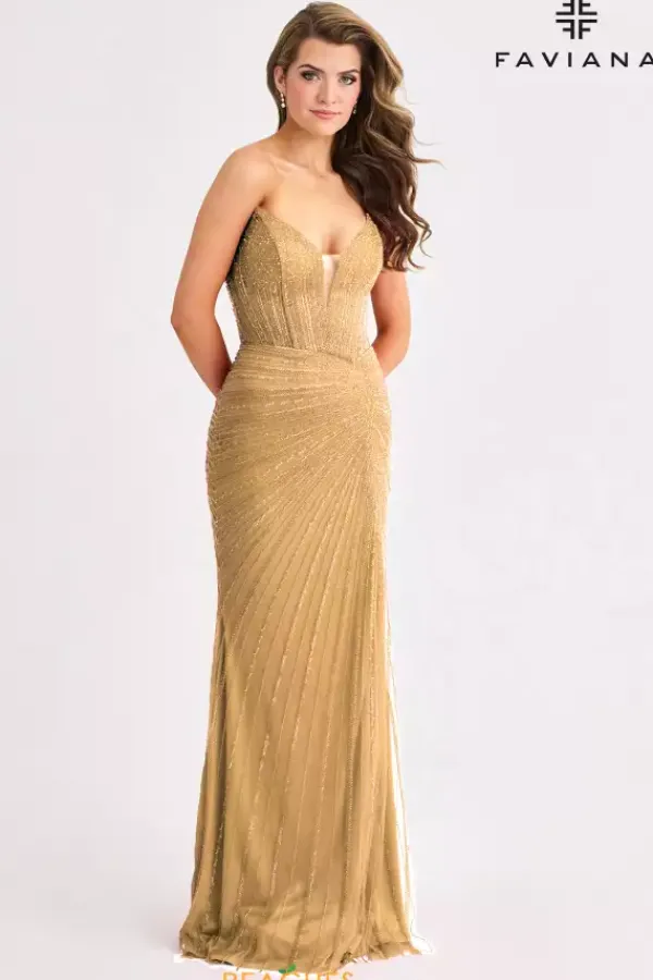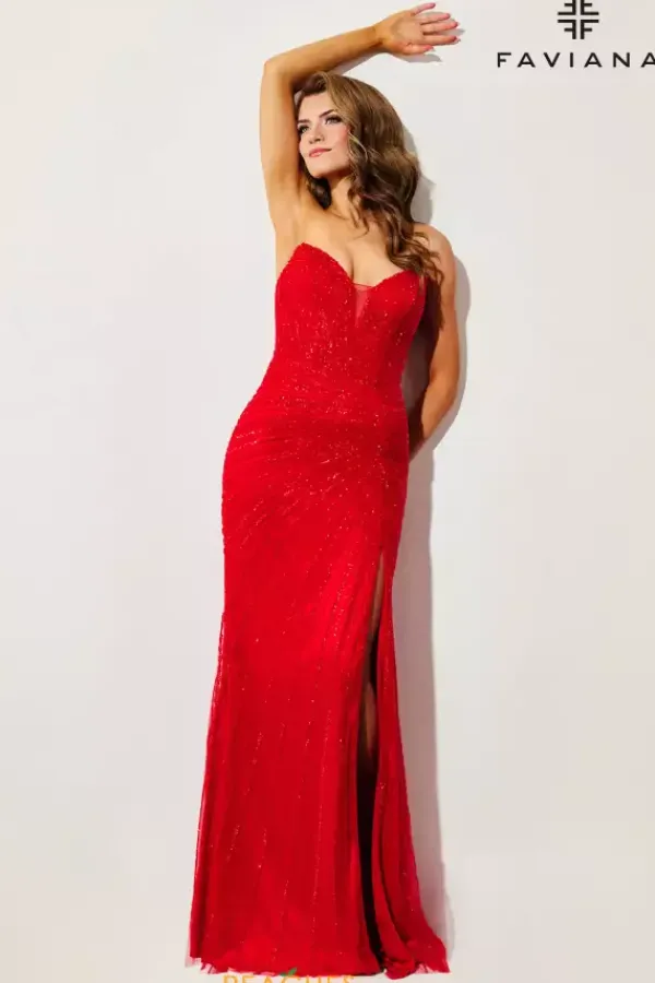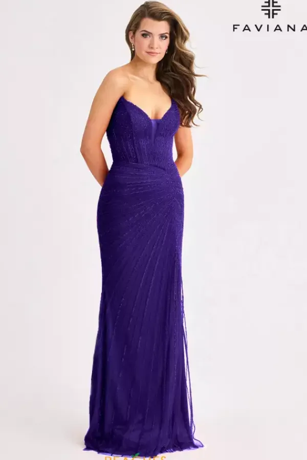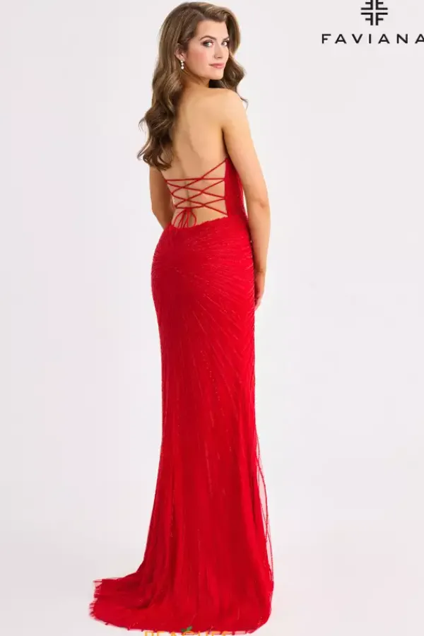 Show up and sh ow off at your special event wearing Faviana style 11410. This eye catching fitted silhouette showcases a fierce v neck strapless neckline paired with an accentuating lace up open back. Completely embellished with dazzling sequins, this dress features a thigh high slit and graceful sweep train.
