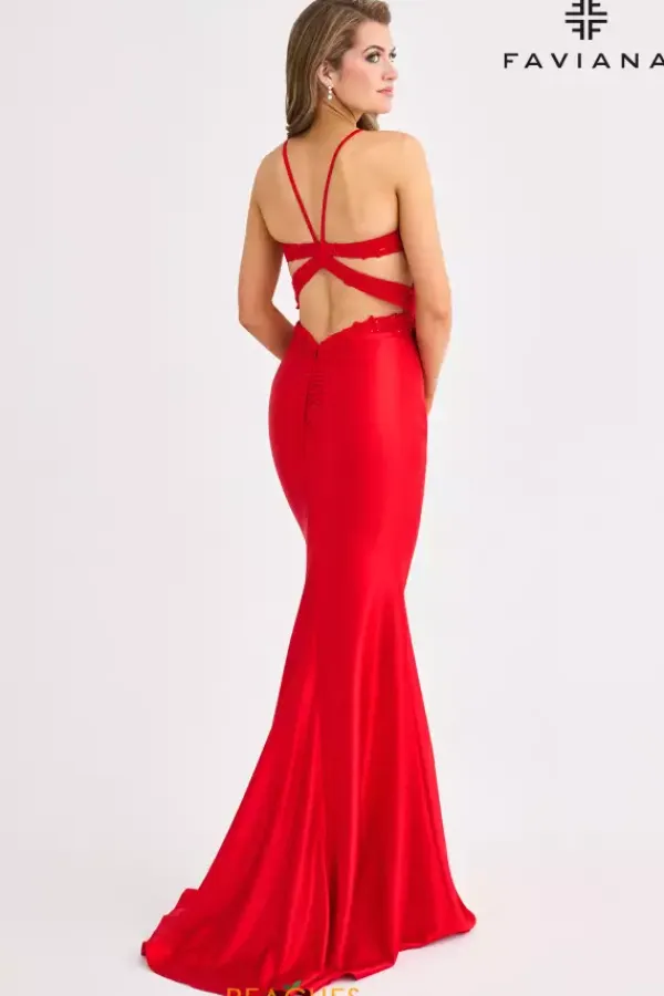 Faviana dress 11414 is the perfect choice for any special occasion. This lovely fitted silhouette showcases a modest v neckline paired with simple shoulder straps. A touch of unique lace applique is adorn on the fitted bodice cascading into the shiny satin material showing off your thigh high slit and intricate open back.