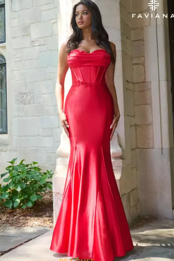 Draw the attention of all the guest on you when they see you wearing this ravishing long fitted dress made by Faviana style 11434. The bodice features a tasteful strapless sweetheart neckline that cascades down to a corset that will hug your figure perfectly. There’s dainty beadwork on the dress that’s made for you. This all over satin material will have you feeling royal.