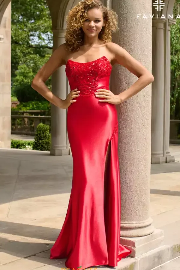 Go simple and classy to your next special outgoing when wearing this flattering long fitted dress made by Faviana style 11435. Featuring a pleasing strapless scoop neckline that highlights the sparking beadwork. Made entirely in lavishing stretch satin material so you can dance comfortably. A high thigh slit is perfect for picture taking.