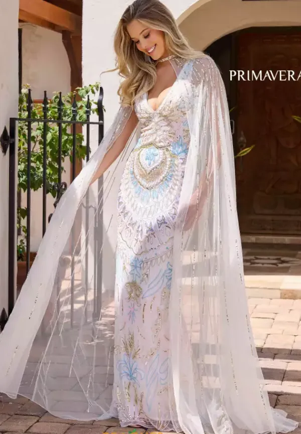 Draw attention immediately in this stunning long style 12176 by Primavera for your upcoming event. Featuring the combination full high neck along the back paired with a flattering v neckline. Adorned delicately all over the fitted silhouette and finishing with the draped overlay cape to hang just along the neck embellished with meticulous beadwork.