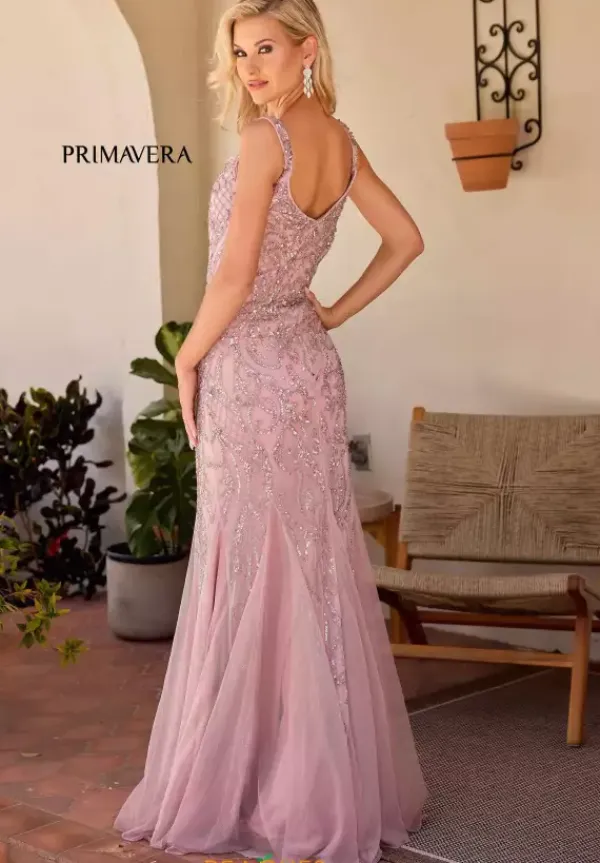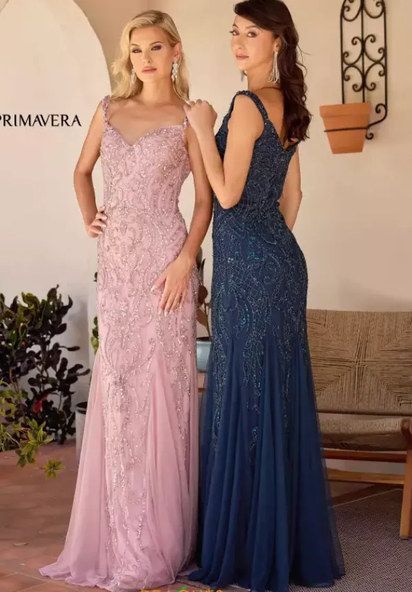 Feel classy and elegant in this gown by Primavera style 13143. Featuring a modest v cut neckline paired with thick supportive straps to give you extra comfort and support. Adorned entirely in a stunning beading to have you dazzling at every angle. The bottom of the gown is given a touch of tulle fabric and a slight train.