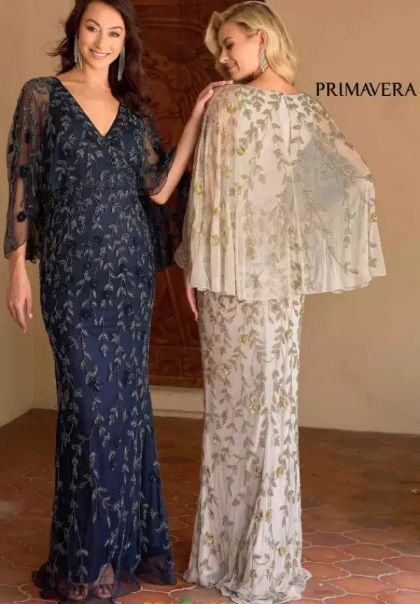 Make a grand entrance in this glamorous gown by Primavera style 13149. Featuring a subtle v cut neckline paired with a stunning cape attached to the straps. Adorned entirely in a stunning beading and sequins made into a chic floral pattern. The fitted silhouette will hug your curves beautifully. A subtle sweep train is added to complete the look.