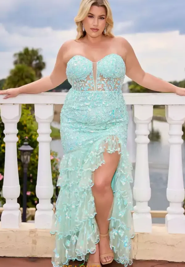 Look ethereal in this magnificent Primavera sequin encrusted prom dress style 14105. The strapless curve enhancing body con silhouette glimmers endlessly with a base adorned in dainty heat set stones that shimmer between the detailing of the sequin vines and leaves that surround the entire multi tiered sweep length dress.