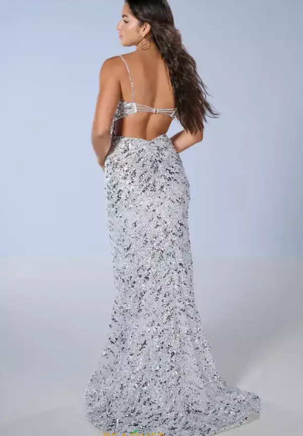 Be the star of the center when wearing this long fitted dress by Tiffany, style 16239. Showcasing a modern v- neckline with delicate straps leading to a sexy open back ending with a back zipper closure. This ensemble has a see through corset top that will hug your body gorgeously. The bottom skirt it’s fitted with a magnificent slit and classy train. Fully embellished with stunning patterns and dazzling beadwork designs throughout the dress.
