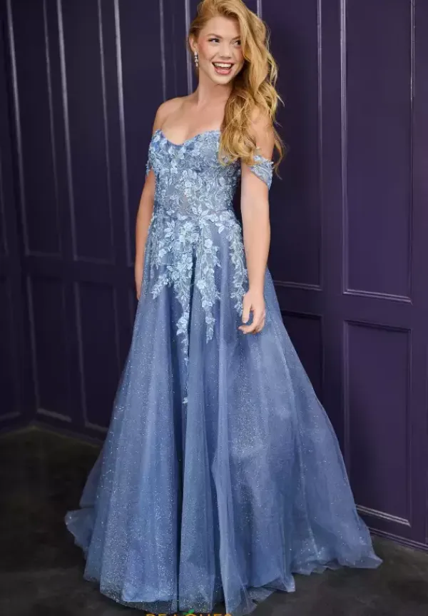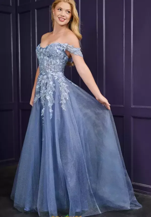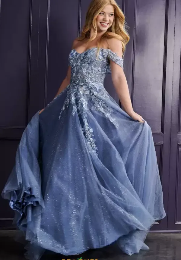 The perfect choice for your upcoming prom is this beautiful A line dress style 16243 by Tiffany. Featuring the straight across neckline paired with detachable swag sleeves. Showcasing the fitted corset lace bodice is adorned meticulously with delicate applique cascading down the small of the waist and sparsely down the full tulle skirt.