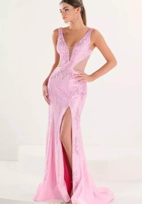 Be the spotlight of the night in this striking Tiffany long dress, style 16260. Featuring thick straps and a deep V neckline, the bodice is adorned with beautiful, intricate beading and bold side cutouts. The fitted skirt showcases a dramatic thigh high slit, while the sexy open back ensures all eyes will be on you.