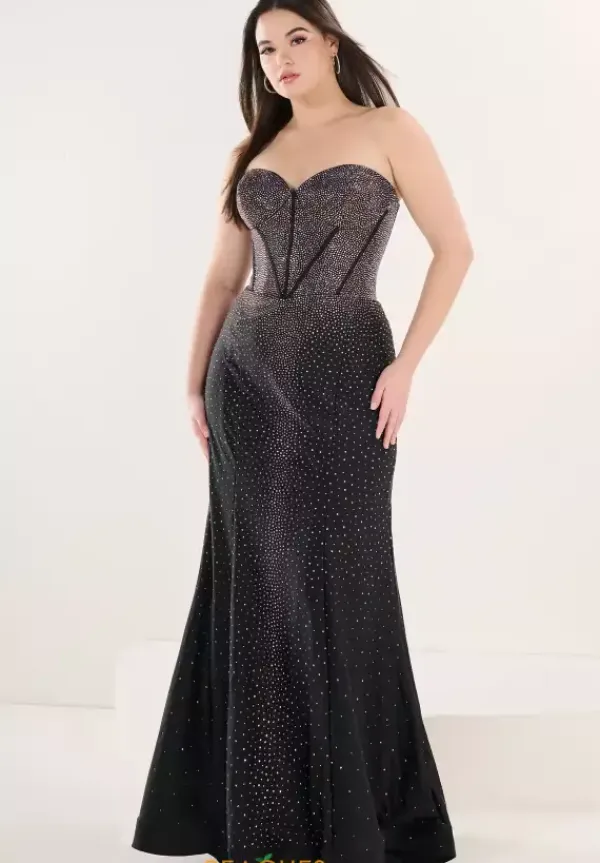 Enter the room with confidence in this ravishing jersey dress designed by Tiffany, style 16282. This long fitted dress showcases a romantic strapless sweetheart neckline and a structured corset. This ensemble is embellished in glistening hot stone beadwork. Have a dramatic exit with this dramatic sweep train.