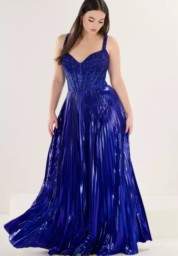 Glisten the night away at Prom in this ravishing Tiffany dress 16303. A plus size exclusive, this striking style features a low v neckline with shimmering beaded straps. Radiant beads adorn the fitted corset bodice giving this gown the perfect pop of glitz and sparkle. The flattering pleated skirt moves gracefully with every step you take.