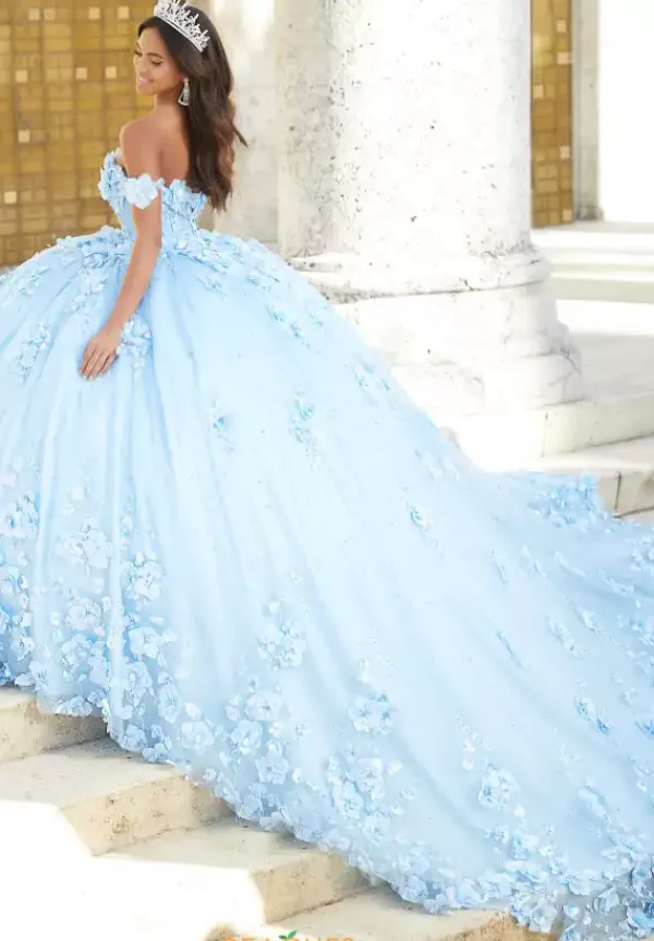 Have your first princess moment in the glamorous ball gown style 26024 by Vizcaya for your upcoming Quince. The gorgeous fitted bodice is complimented with delicate cap sleeves and is enclosed along the back with a corset lace up. Displaying elegant bead work and three dimensional floral detailing that trails down the full tulle skirt and makes its way down the very bottom of the sweep train.