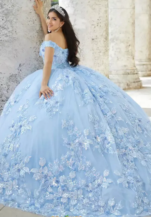 Feel like a princes in this enchanting Tiffany Quinceanera style 26027. The fairy like ball gown reveals an off the shoulder neckline. The striking fitted bodice is beautifully adorned with 3D flowers that also trickle along the full skirt. The full skirt is also delicately decorated with glittery lace detail that adds a perfect finishing touch to this elegant ball gown.