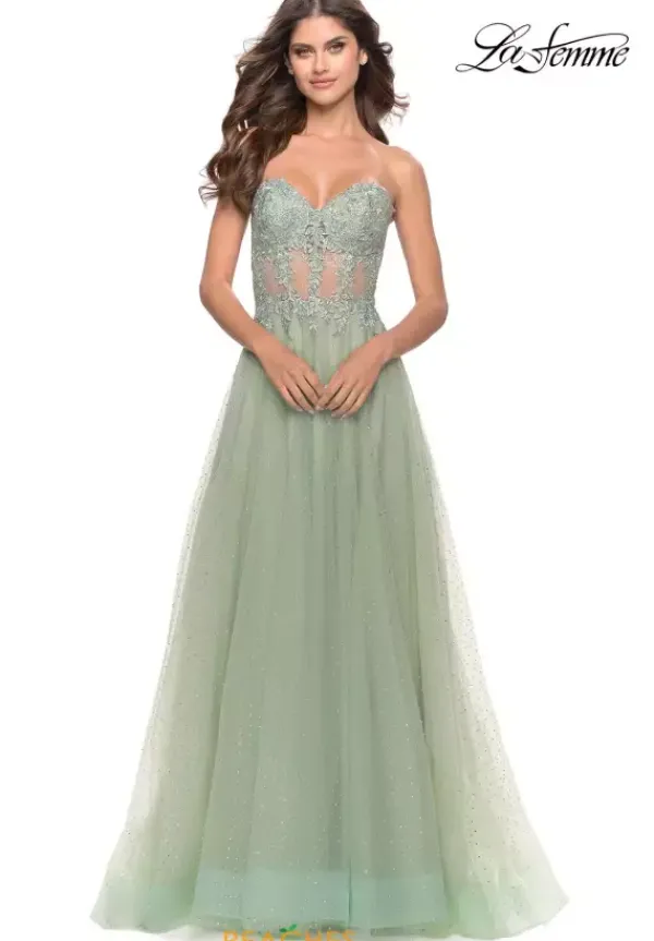 Graceful and enchanting La Femme style 31367 blends lace and tulle for an ethereal look. Displaying a sweetheart strapless neckline for the lovely fitted bodice, beautifully adorned with lace made glittering with beading. The tulle skirt flares out for an A line cut, also decorated with pretty beading.